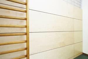 Es wurde eine neue Unterkonstruktion erstellt, auf der der Prallschutz verklebt wurde. Damit die Sporthalle auch weiterhin mit den vorhandenen Heizkörpern beheizt werden konnte, wurde diese Konstruktion entsprechend den Vorgaben des Architekten ausgebildet. Der Sportbetrieb kann ab jetzt sicher stattfinden.